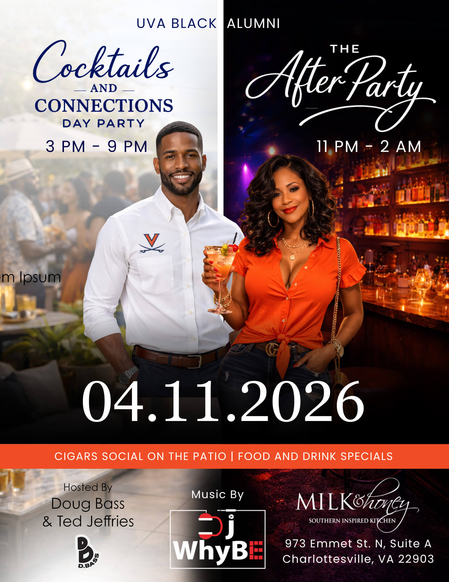 Hey Hoos! Join UVA Black alumni at Milk & Honey for an afternoon of connecting with old and new friends all while indulging in delicious Southern cuisine, specialty cocktails, and cigars. Then, return at 10 p.m. for our afterparty! This event is hosted Doug Bass (Col class of ’94) and Ted Jeffries (Col class of ’93), and DJ’d by DJ WhyBe (Col class of ’95). Come for what is sure to be a memorable night!